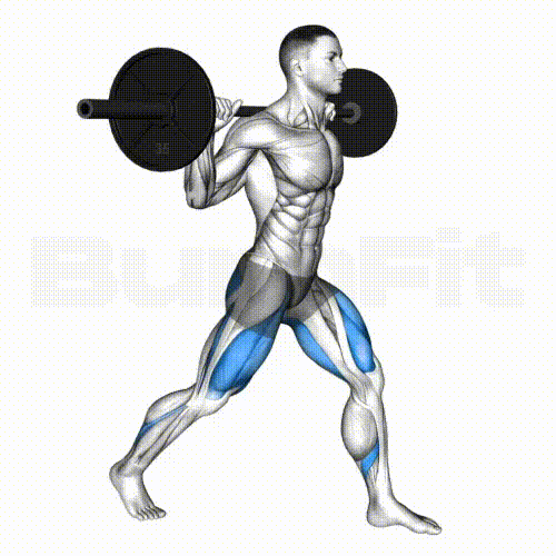 1. 바벨을 등 뒤 어깨 위에 올려둔 상태로 양발을 앞뒤로 벌리고 섭니다.