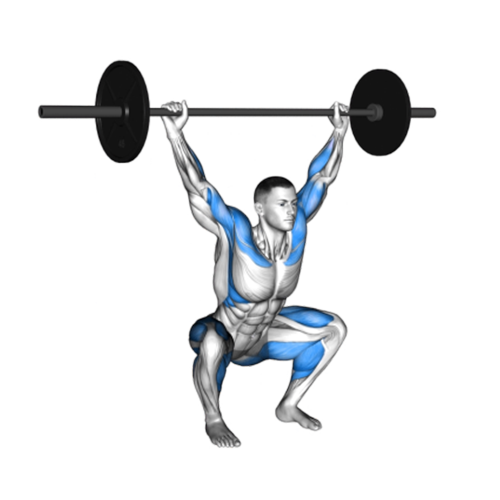 1. 바벨을 넓게(스내치 그립) 잡고 머리 위로 들어올립니다.