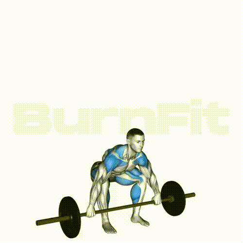 - 시작 자세: 양발을 골반보다 약간 넓게 벌리고, 바벨을 넓게 잡고 두 팔은 곧게 폅니다.