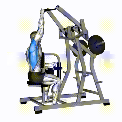 2. 허벅지를 지지대에 고정하고 가슴을 편상태로, 손잡이를 잡은 한손의 팔꿈치를 옆구리 방향으로 힘차게 내립니다. (이때, 견갑골을 모으면서 팔꿈치는 바닥과 수직방향으로 움직입니다.)