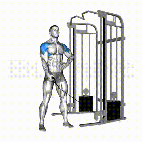 - 측면 어깨(삼각근)에 자극을 느끼면서 팔꿈치를 올린다는 생각으로 케이블을 들어 올립니다.