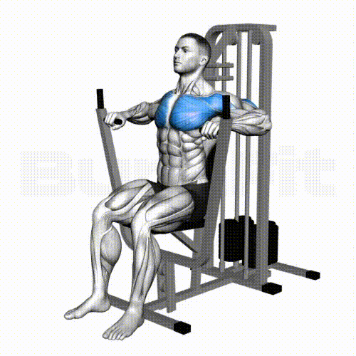 - 양손으로 손잡이를 잡고, 가슴에 힘을 주면서 앞으로 밀어줍니다. (이때, 손잡이가 가슴 중앙에 위치할 수 있도록 벤치 높이를 조절합니다.)