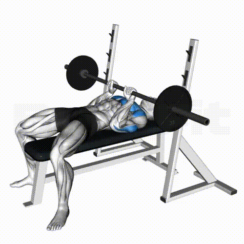 1. 벤치에 가슴을 펴고 누운 상태에서, 바벨을 어깨너비보다 조금 좁게 잡고 위로 들어올립니다.