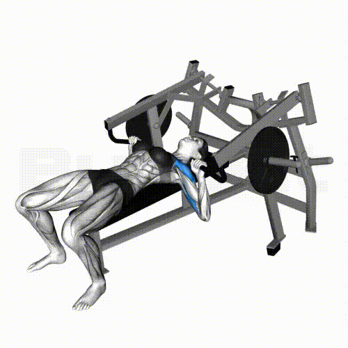 2. 허리를 벤치에 붙이기보다 아치형을 만든 상태에서 기구를 위로 들어올립니다. 이때 팔을 완전히 뻗는다기 보다는 가슴 근육을 수축시켜 준다는 느낌으로 들어올립니다.