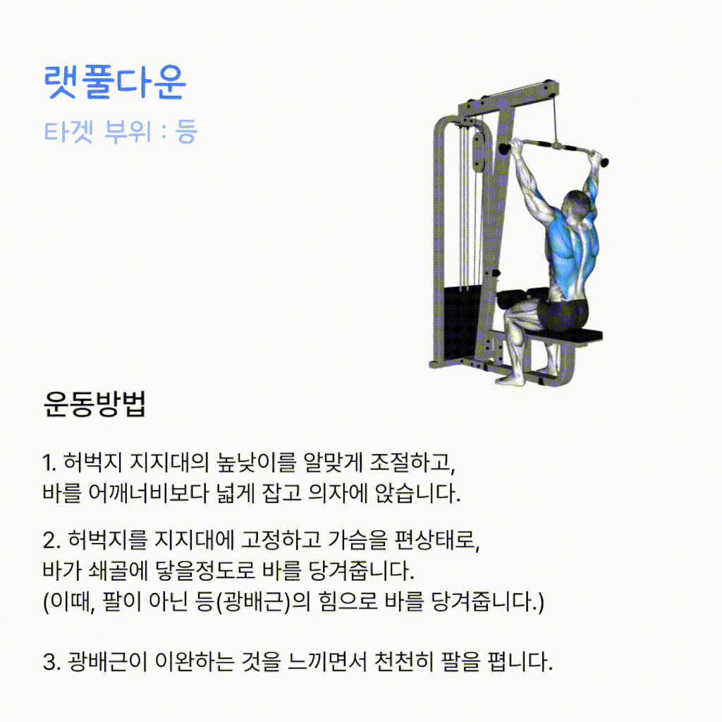 주로 넓은 등 근육(랫)과 이두근을 타깃으로 합니다. 이 운동은 등 근육의 강화와 넓어 보이는 등 실루엣을 만드는 데 유용합니다.
