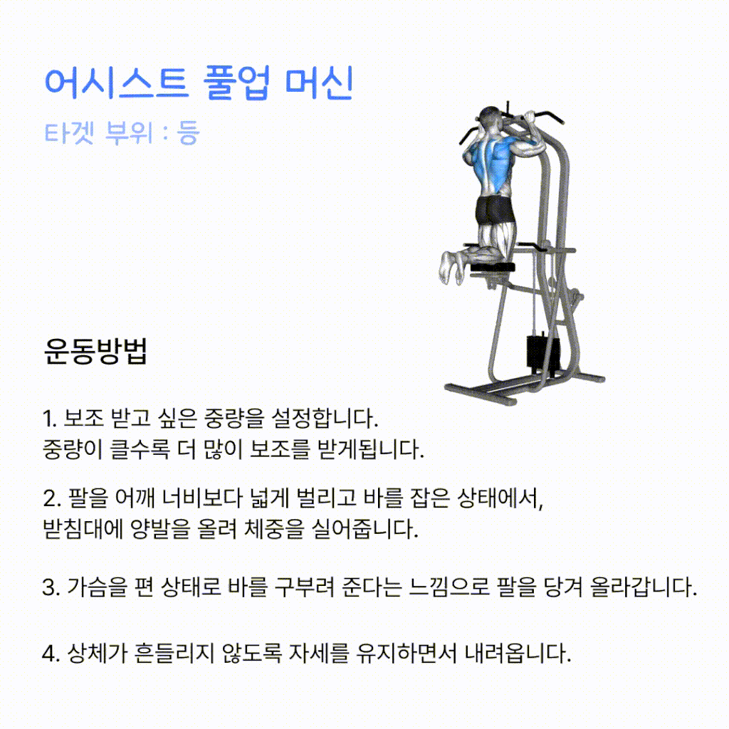 | 어시스트 풀업 머신 | 5세트 | 8~10회 |