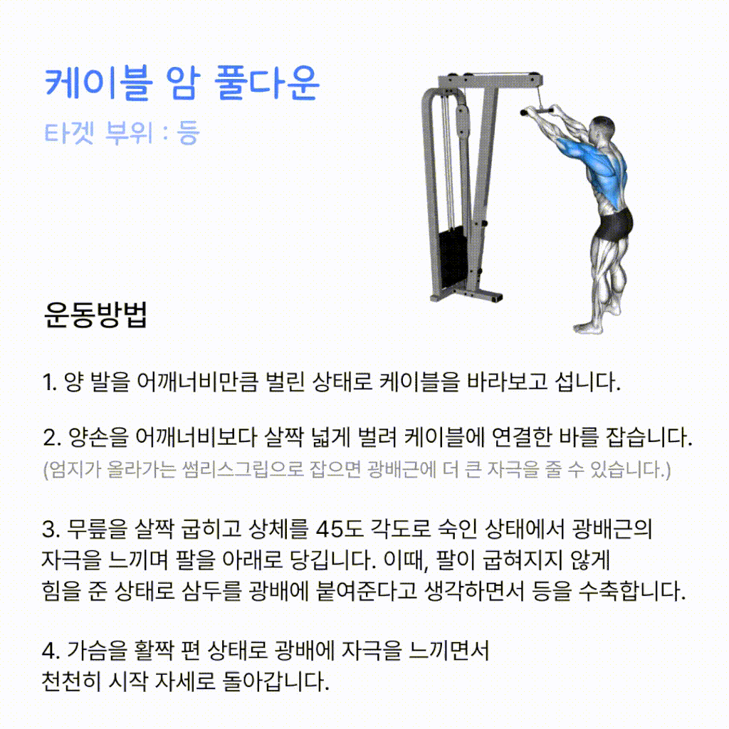 | 케이블 암 풀 다운 | 2세트 | 8~10회 |