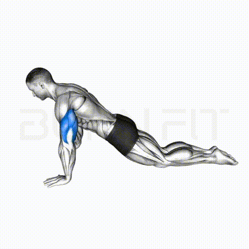 번핏 워터마크가 있는 초보자 맨몸운동 애니메이션 GIF, 정자세 푸시업(팔굽혀펴기)을 수행하며 가슴과 삼두근을 단련하는 동작