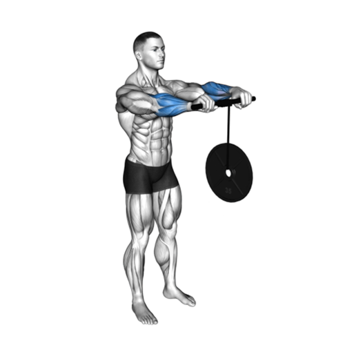 - Stand with your feet hip-width apart and make sure your upper body is straight while holding a dumbbell in both hands.