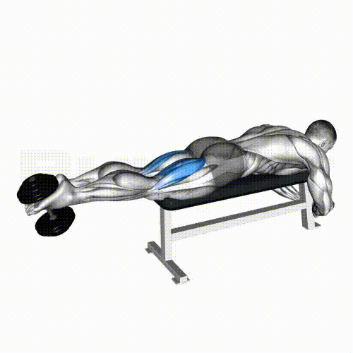 - Lie face down on a bench and hold a dumbbell with both feet.