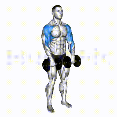 - Hold dumbbells with your both hands slightly narrower than the shoulder-width and place them slightly on your thighs.