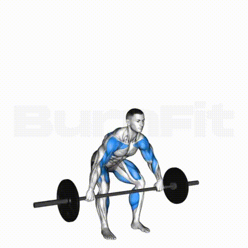 - Starting position: with your feet slightly wider than your hips, hold the barbell wide and let your arm straight.