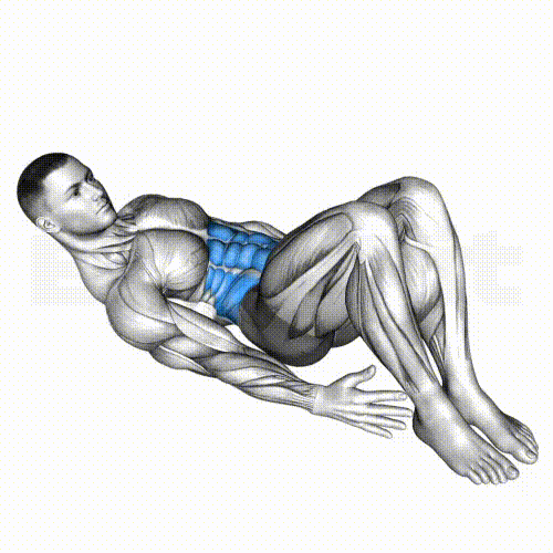 - While lifting the upper body with tension on your abs, touch the same side of the heel with one hand.