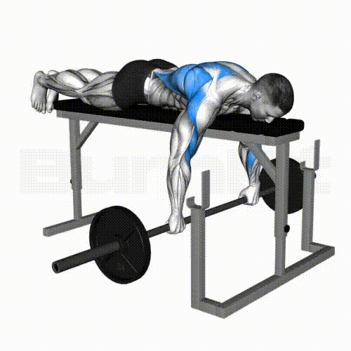 - Lie face down on a bench and grab a barbell slightly wider than shoulder-width apart.