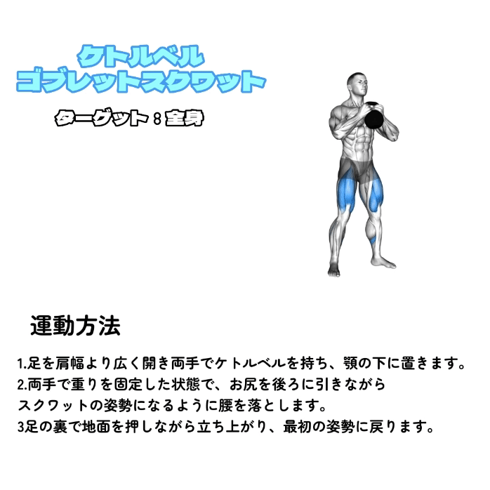 | ケトルベルゴブレットスクワット | ケトルベル | 2〜5セット | 12回 |