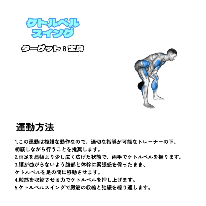 | ケトルベルスイング | ケトルベル | 2〜5セット | 15回 |