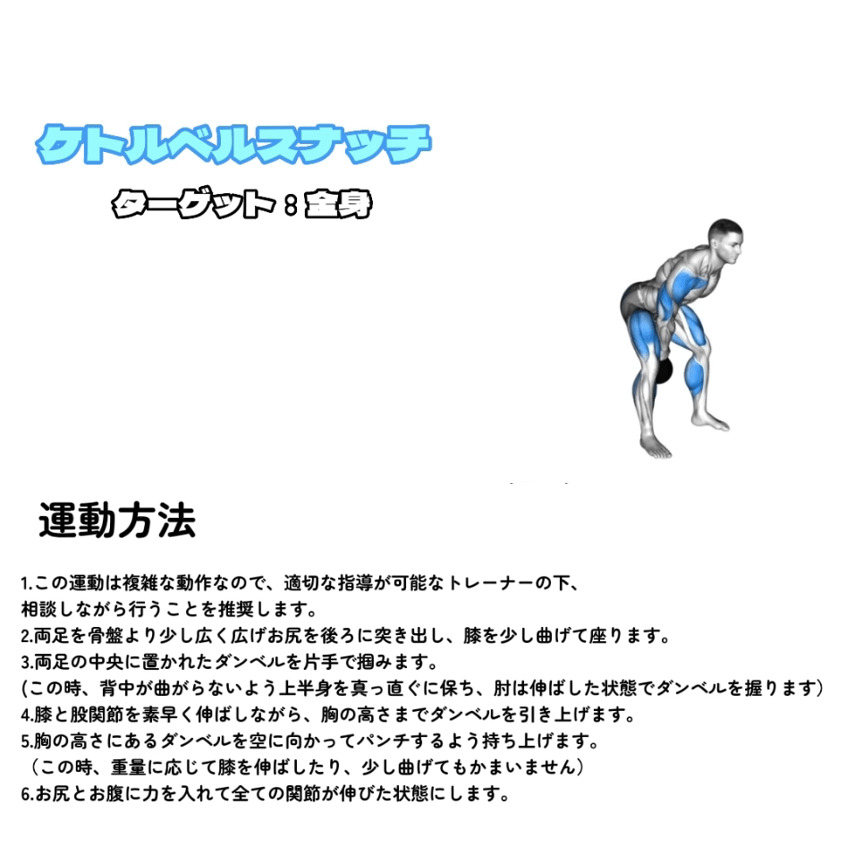 | ケトルベルスナッチ | ケトルベル | 2〜5セット | 8回 |
