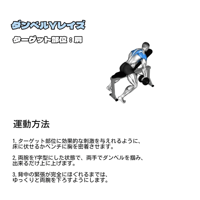| ダンベルYレイズ | 2セット | 10回 |