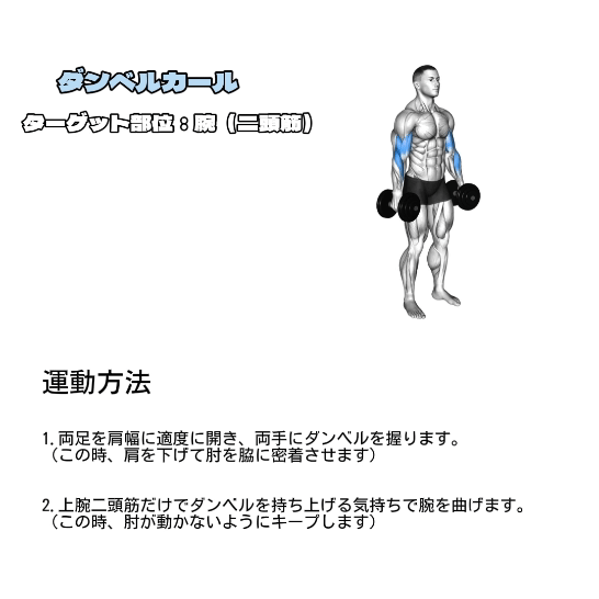 | ダンベルカール | 3セット | 8〜10回 |