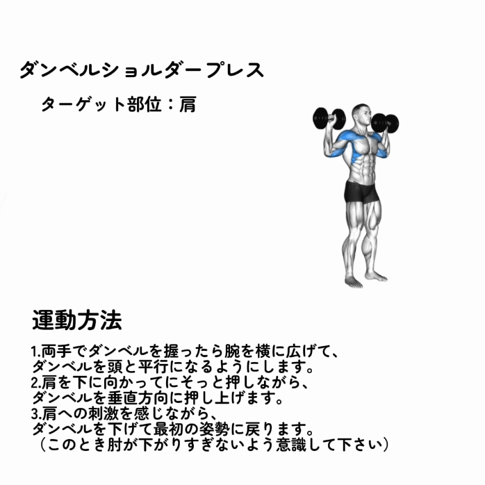 | ダンベルショルダープレス | 2セット | 10回 |