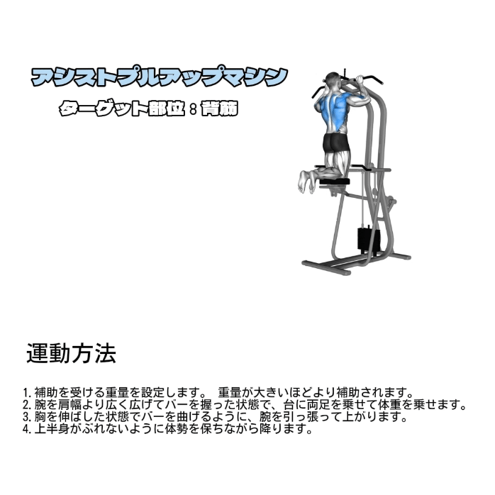| アシストプルアップマシン | 2セット | 8〜10回 |