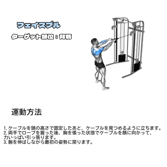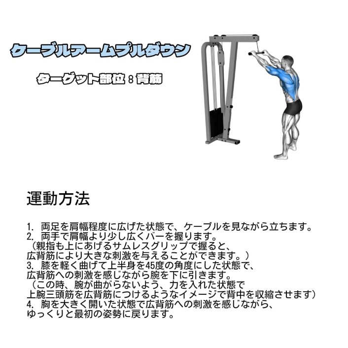 | ケーブルアームプルダウン | 2セット | 8〜10回 |