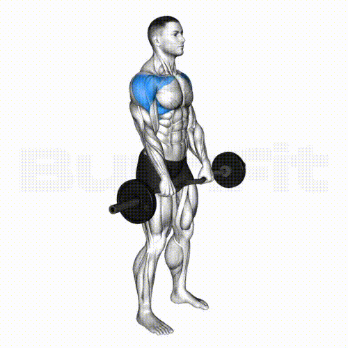 - 前のバーベルを両腕をまっすぐにしてゆっくりと持ち上げます。 この時、肩の前の筋肉を収縮するように持ち上げます。