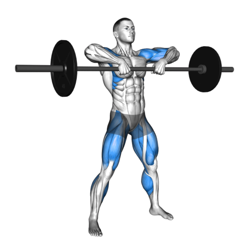 1. 足を肩幅に開いて、手の甲を上側に向けてバーベルを持ちます。