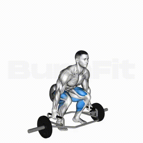 2. 上半身をまっすぐに保ち、膝を曲げてトラップバーを両手で掴みます。 このとき、膝を前に曲げて、従来のデッドリフトよりもスクワットの位置に近づけます。