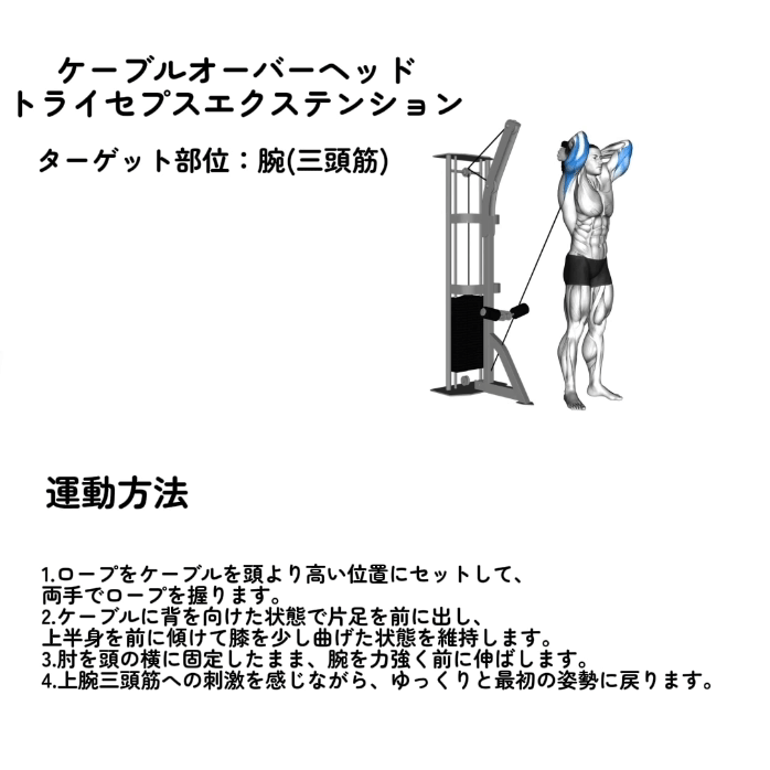 | ケーブルオーバーヘッドトライセプスエクステンション | 2セット | 12〜15回 |