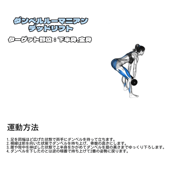 | ダンベルルーマニアンデッドリフト | 2セット | 8〜10回 |